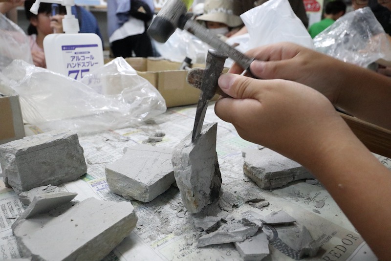 4つ〜5つの石が渡され、トンカチで割る化石発掘体験です。