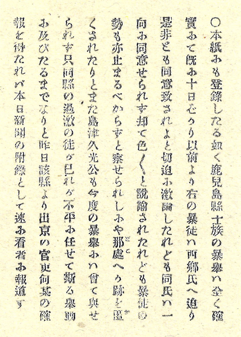 東京日日新聞の報道では、西郷は「決起を促した」のではなく、